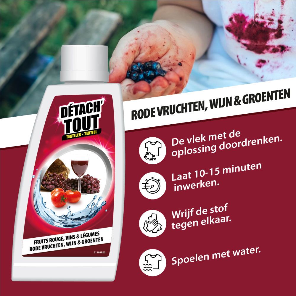 Een glas wijn omgestoten, een spat rode vruchten of een spoor van groenten? Geen paniek! De Détach’tout Rood Fruit, Wijn & Groenten verwijdert snel de meest hardnekkige gekleurde vlekken van je textiel.