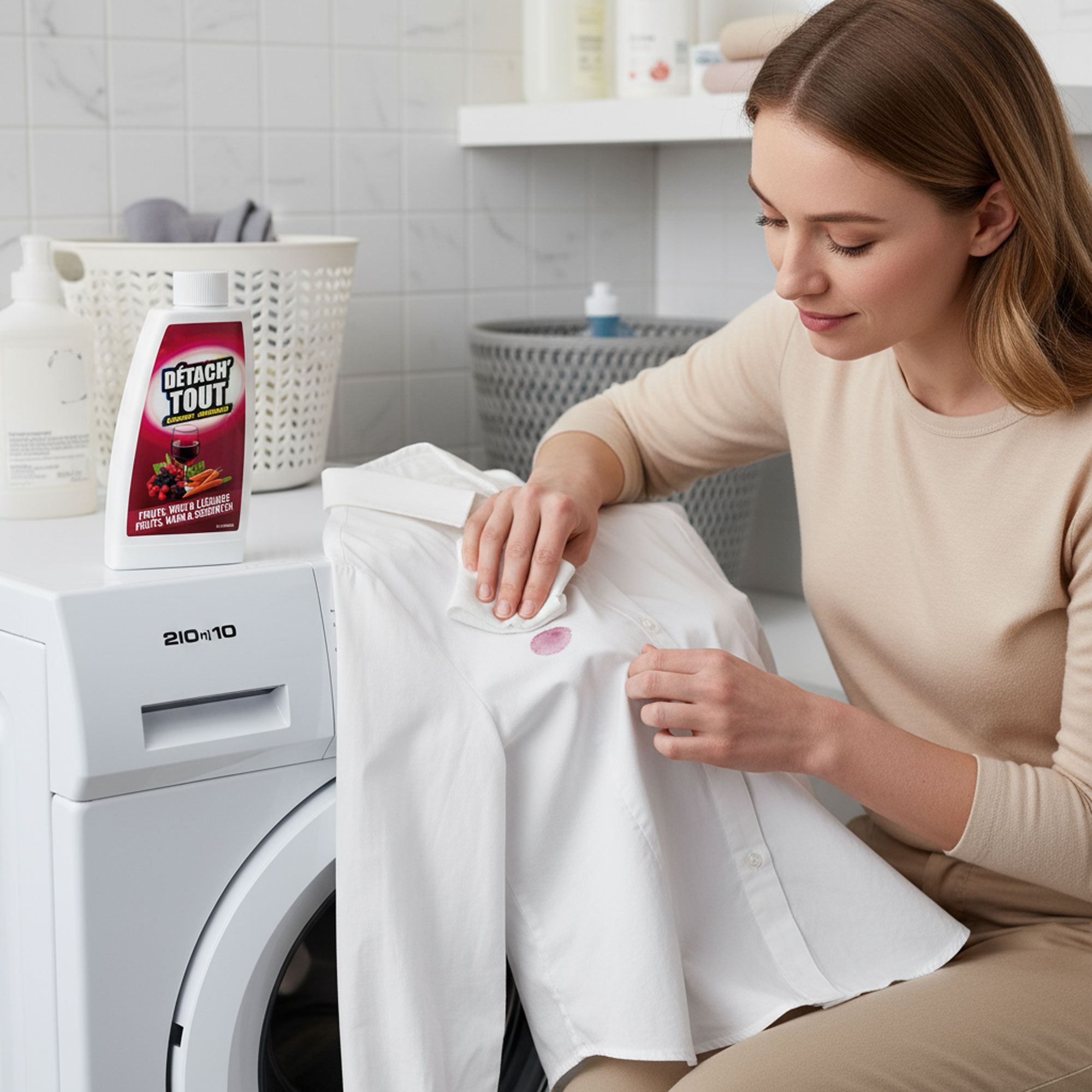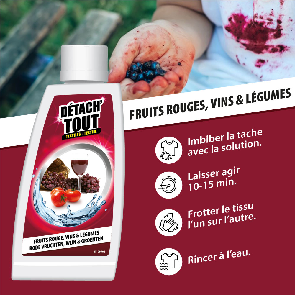 - Efficace sur les taches de fruits rouges, vin, légumes, jus, confiture.