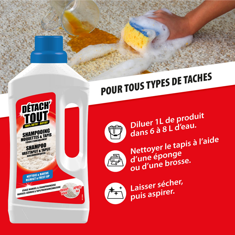 Vos tapis et moquettes accumulent salissures et taches au fil du temps ? Le Détach’tout Moquettes & Tapis nettoie en profondeur et redonne éclat et fraîcheur à vos textiles d’ameublement.